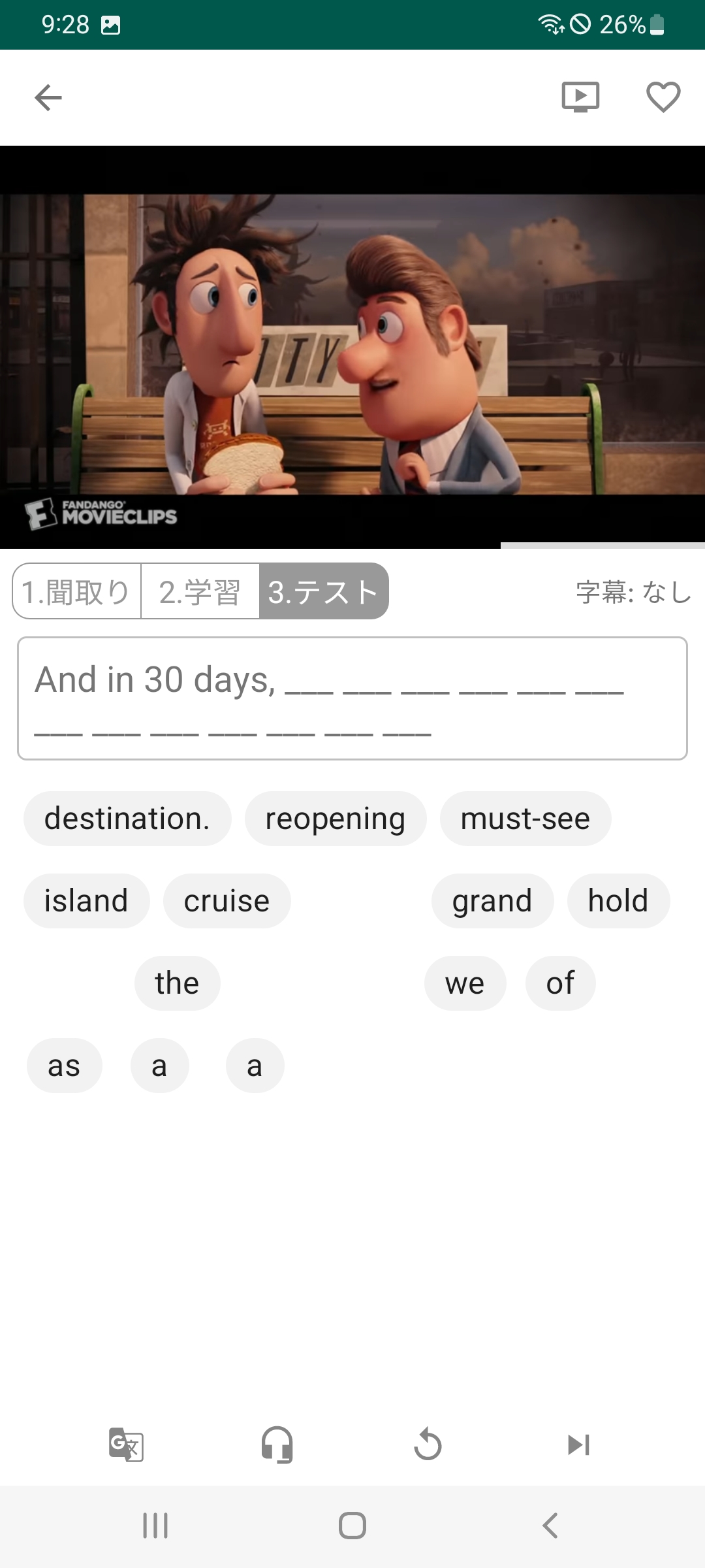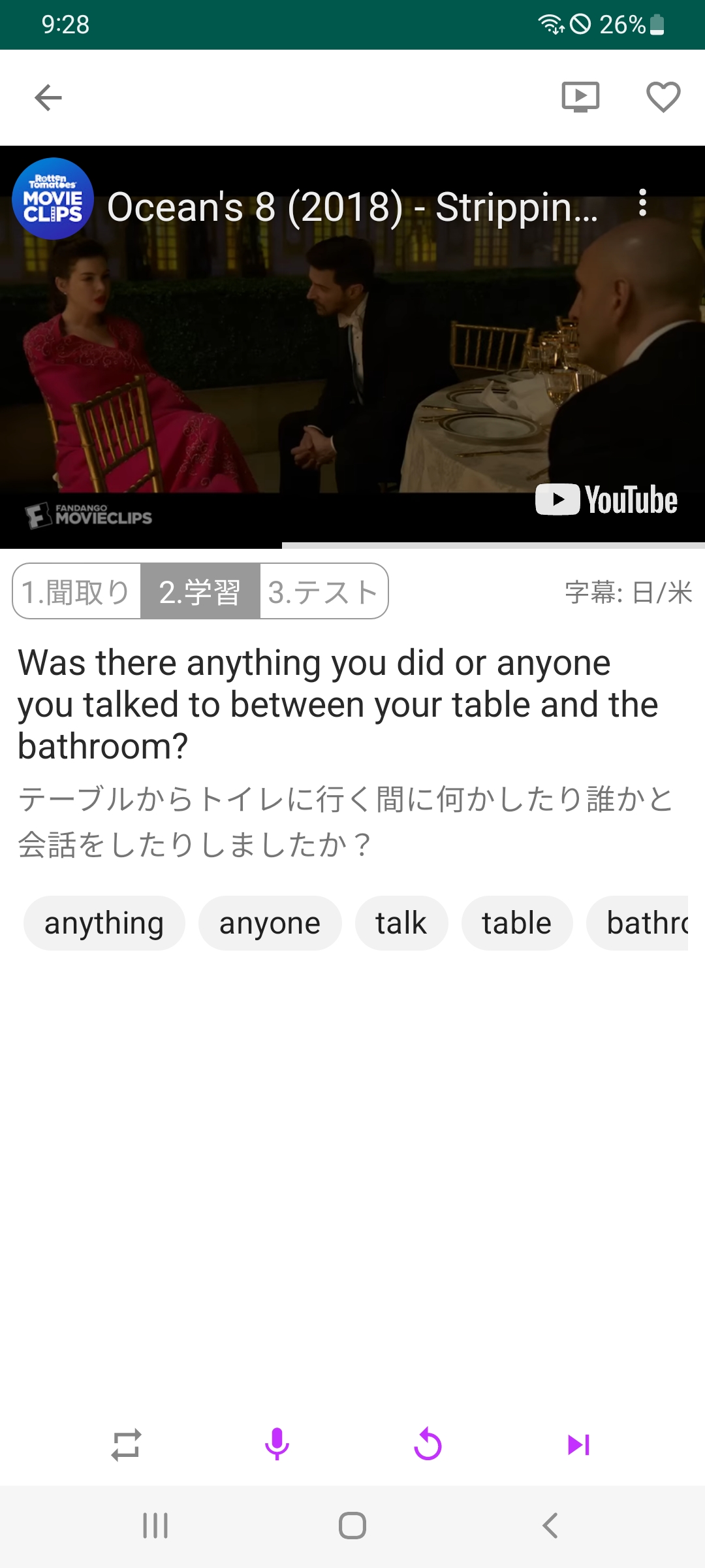 1 Video Everydayアプリは3段階の過程(聞き取り、学習、テスト)で学習するようになっていますが、2番目の学習モードに区間リピート機能があるので学習モードでディクテーションをされればいいです。