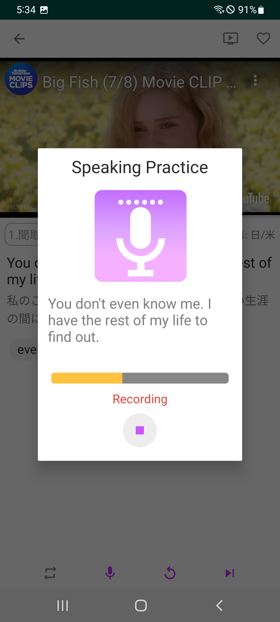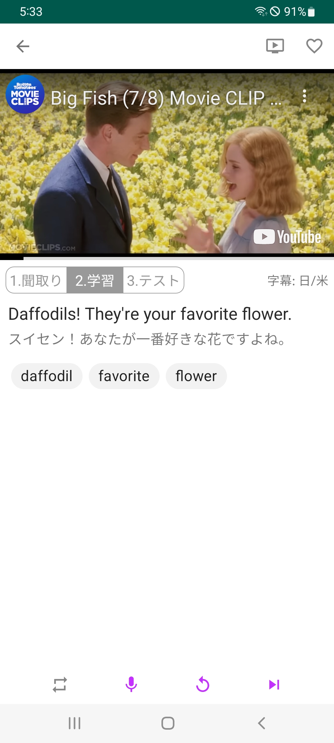 1 Video Everydayアプリは3段階過程(聞き取り、学習、テスト)で学習するようになっているんですが、2番目の学習モードがシャドーイングの練習をするのに非常に良いです。